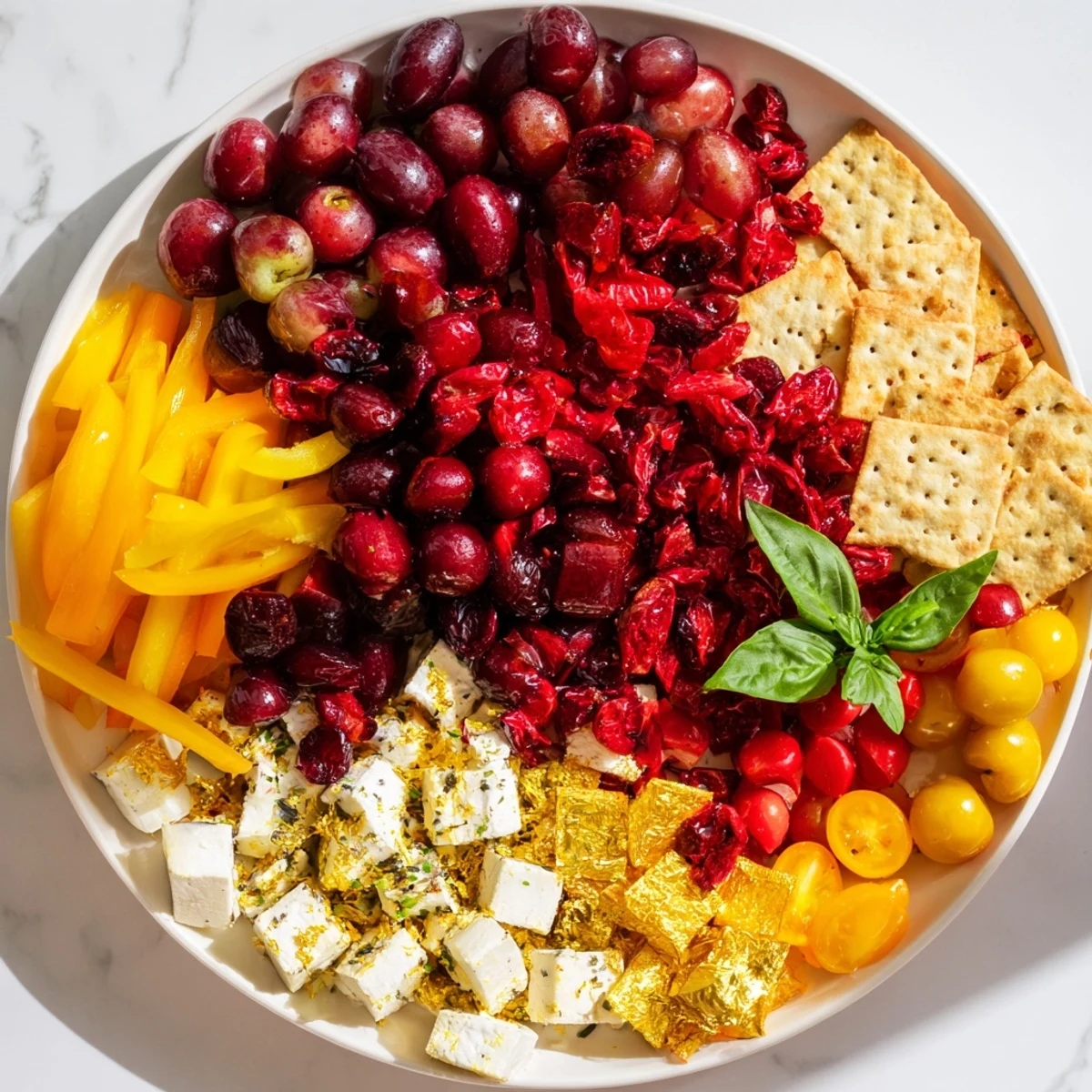 - Auf der gegenüberliegenden Seite der Platte bauen Sie Ihren zweiten Block auf: die geröteten Paprika-Streifen, die Cheddar- oder Gouda-Würfel, die mit Blattgold verzierten Cracker, die goldenen Rosinen, und die gelben Kirschtomaten. Das Gelb gegen das Rot – es ist ein visuelles Drama, das von innen heraus leuchtet.
