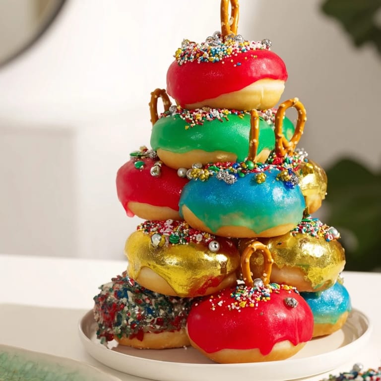 Merken Ein verspielter und festlicher Dessert-Mittelpunkt mit gestapelten Mini-Donuts, die wie bunte Weihnachtskugeln dekoriert sind. Perfekt für Weihnachtsfeiern kombiniert dieser essbare Turm süße Aromen mit auffälliger Feiertagsfreude.