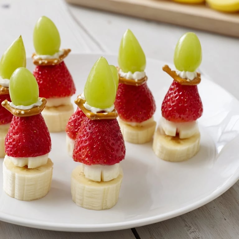 Merken Elf Hat Strawberry Spieße sind ein verspielter und gesunder Snack mit saftigen Erdbeeren, Bananenscheiben und Trauben, perfekt für Kinder und festliche Zusammenkünfte.