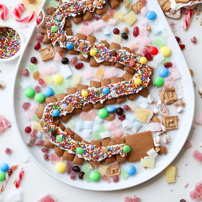 Merken Ein verspieltes Dessertbrett inspiriert vom klassischen Candy Land Spiel, mit Lebkuchenpfaden, bunten Süßigkeiten und süßen Leckereien für eine festliche Präsentation.