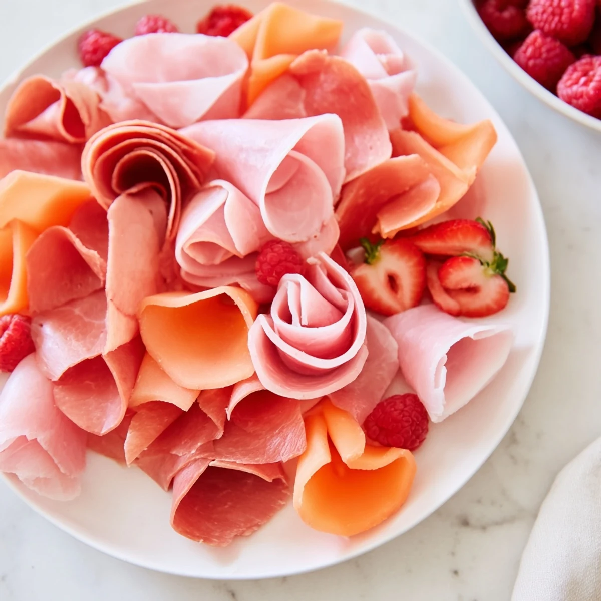 - Nimm jede Prosciutto-Scheibe und rolle sie eng wie eine kleine Rose. Es ist okay, wenn die ersten nicht perfekt sind – es ist wie Malen, es wird mit jeder besser. Platziere diese Rosen in kleinen Gruppen auf der Platte, als würdest du einen Garten pflanzen