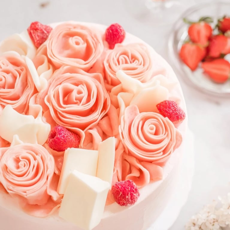 Frische Erdbeeren, Himbeeren sowie essbare Rosenblätter oder Microgreens sorgen für fruchtige Akzente und eine elegante Garnitur.