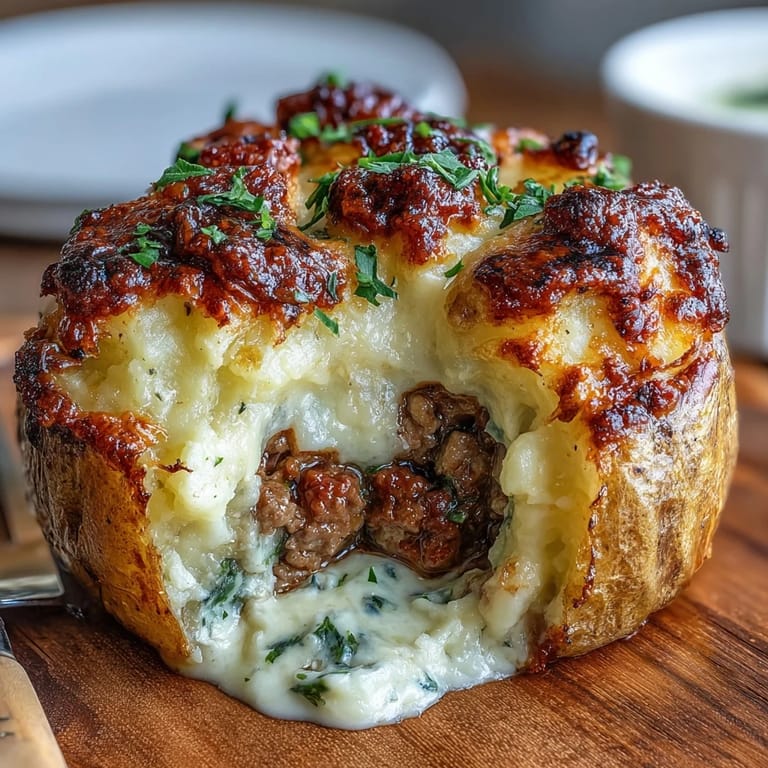 Merken Mein Sohn kam eines Winterabends nach Hause und sagte, er hätte bei einem Freund Shepherd's Pie gegessen – und ich dachte mir, warum nicht diese klassische britische Komfortnahrung in etwas Einfacheres verwandeln? Gebackene Kartoffeln sind ohnehin schon perfekt, also warum nicht das herzhafte Rindfleisch-Gemüse-Ragout direkt hineinpacken und mit cremiger Kartoffelpüree toppen? Seitdem ist dieses Gericht unser liebstes Wochentag-Dinner – schnell gemacht, wärmend und irgendwie großzügiger als das Original.