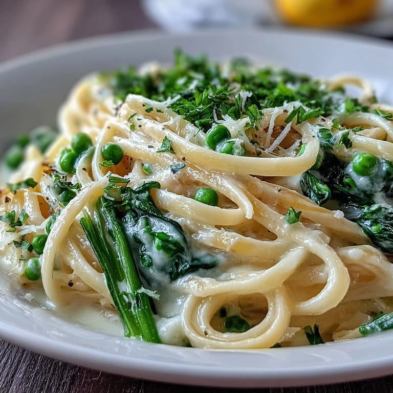 Merken Celebrate the arrival of spring with this bright and flavorful Spring Pasta with Lemon Cream Sauce and Peas. Tender linguine bathed in a silky lemon cream sauce meets fresh green peas and vibrant spinach, creating a deliciously light yet comforting main dish. Garnished with zesty lemon and Parmesan, this recipe effortlessly brings freshness and indulgence to your table in just 30 minutes.