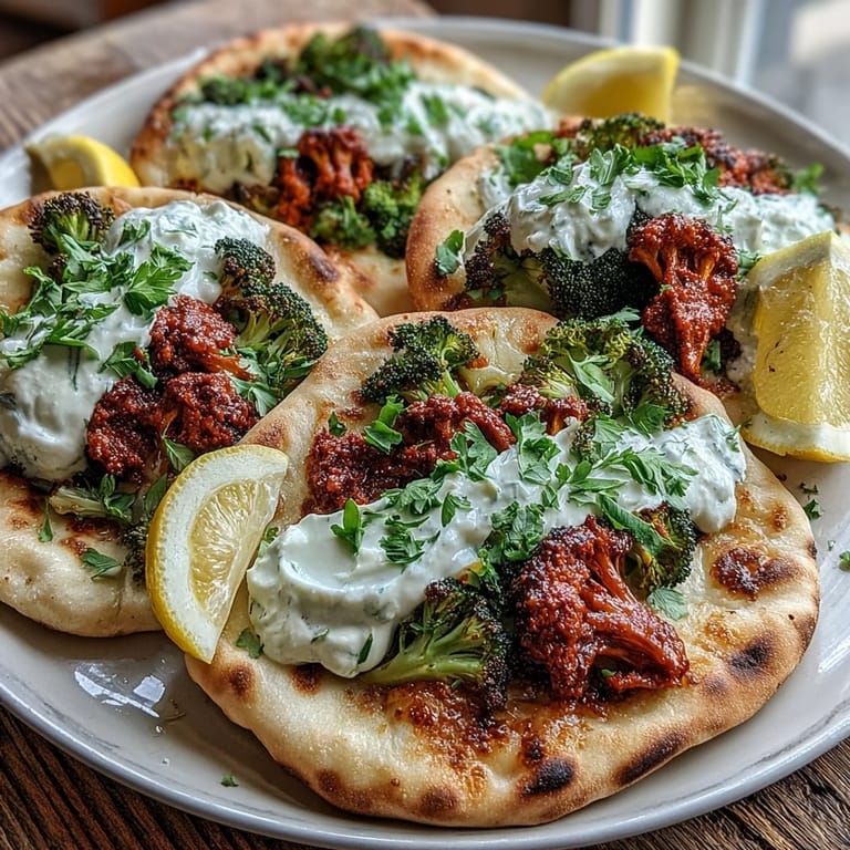 - Serve the harissa broccoli piled onto the flatbreads. Squeeze lemon wedges over the top.