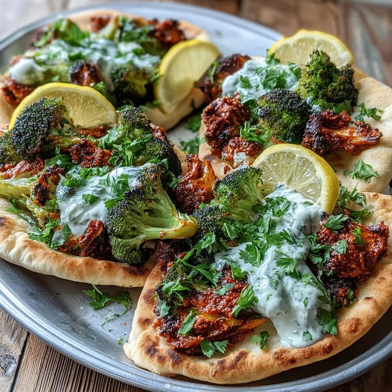 Merken A vibrant, spicy one-pan vegetarian meal featuring roasted broccoli tossed in harissa, served with warm flatbreads for a quick and satisfying dinner. This Middle Eastern-inspired dish brings together charred vegetables and soft bread for a perfect weeknight treat.
