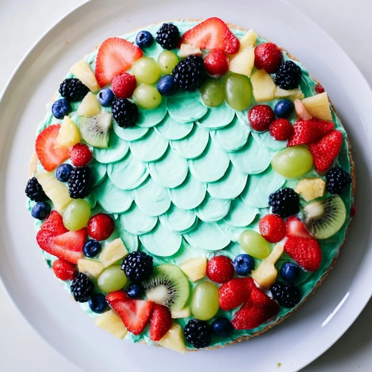Merken Eine verspielte und farbenfrohe Dessertpizza mit einem Zuckerplätzchenboden, bedeckt mit cremigem Frosting und einer Vielzahl von frischen Früchten, die in einem wunderschönen Meerjungfrauenflossen-Muster arrangiert sind – perfekt für Partys oder Themenfeiern.